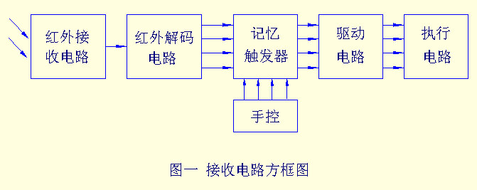 通过接收电路方框图可知红外线接收电路由红外接收头、红外解码电路、记忆触发器、驱动电路、执行电路和手控电路等部分组成。其详细的原理电路图见图二。